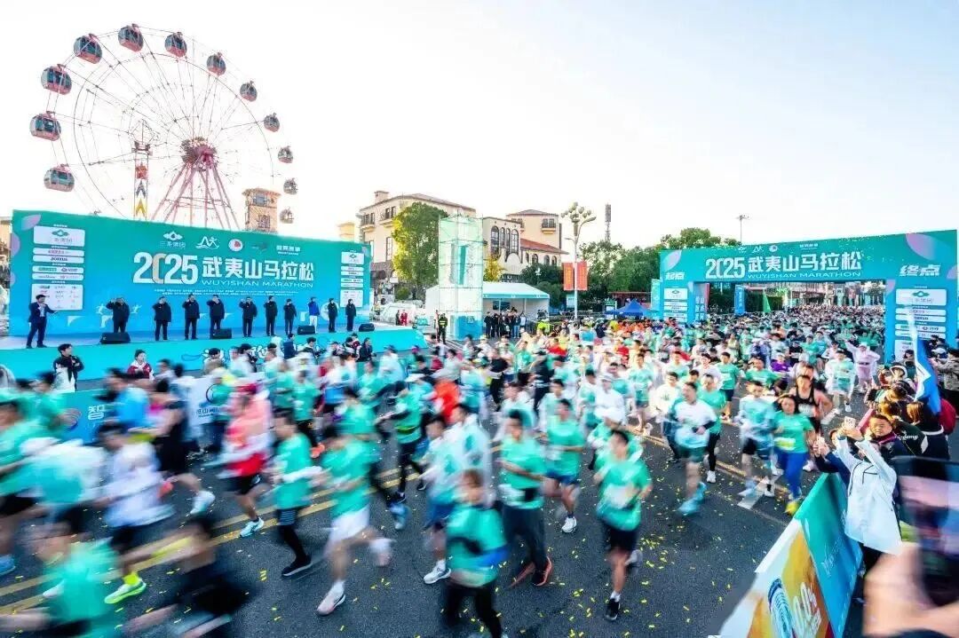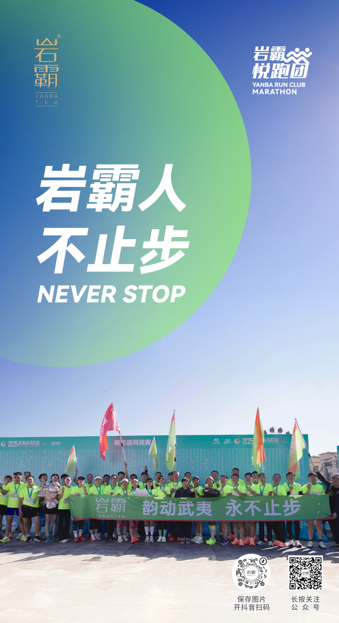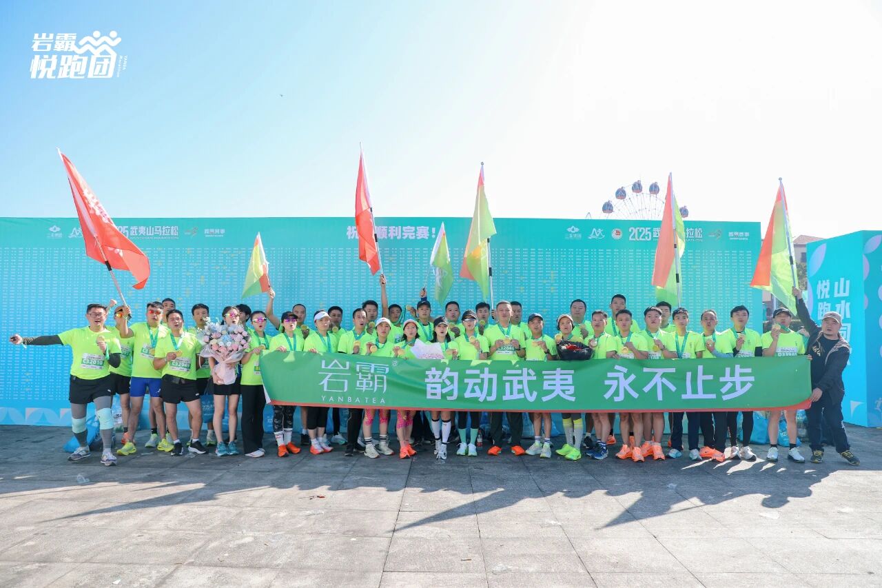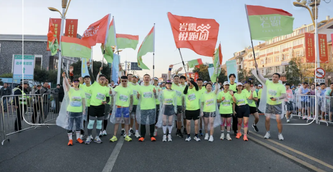 在万千跑者中,一支身着春绿色战服的队伍格外醒目——这正是永不止步的“岩霸悦跑团”。从2023年成立至今,悦跑团四度征战武夷山马拉松,由岩霸团队号召的员工与各地经销商组成,愿通过奔跑传递“永不止步”的精神,展示“动静皆宜、知行合一”的茶人风采。