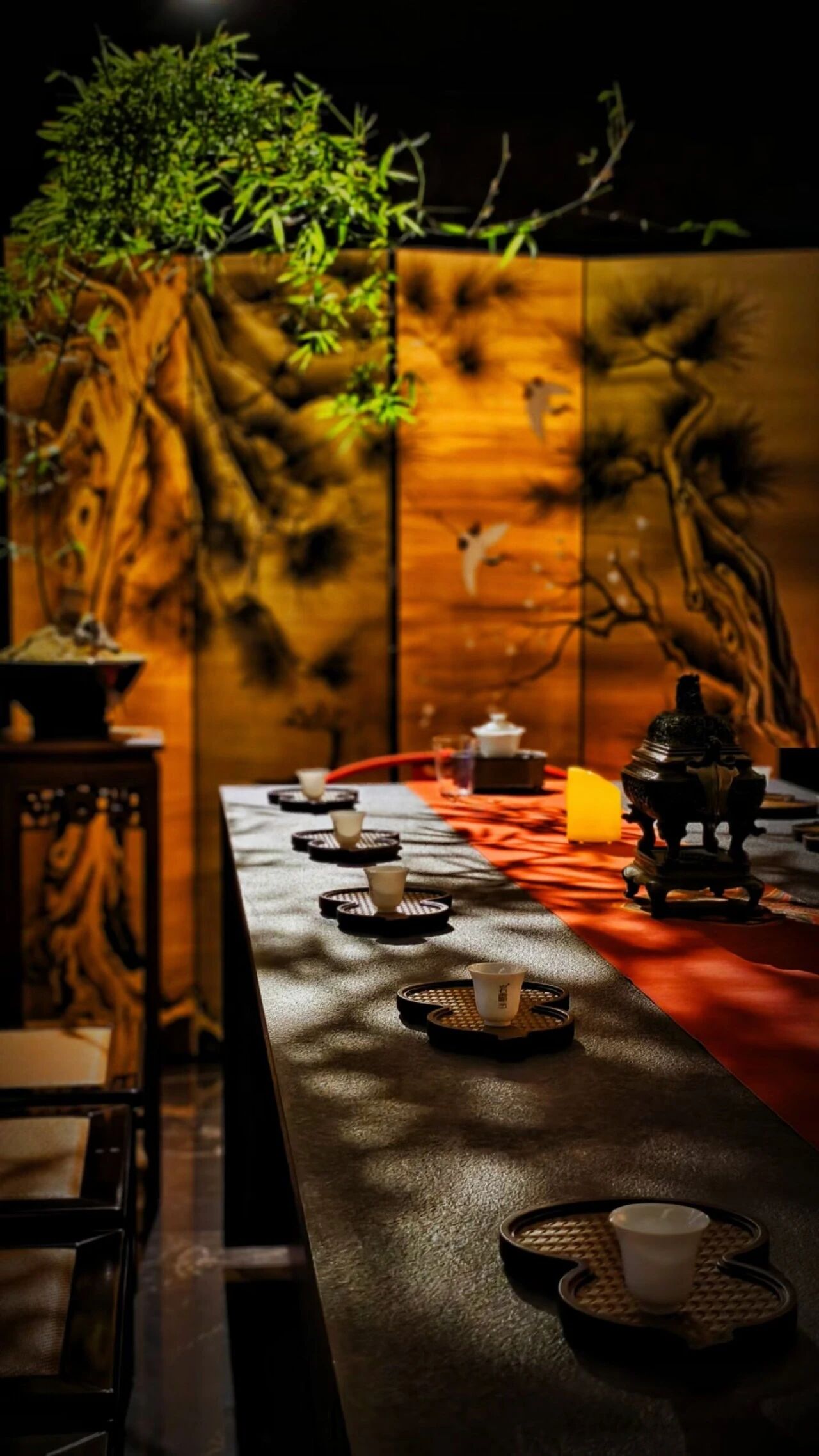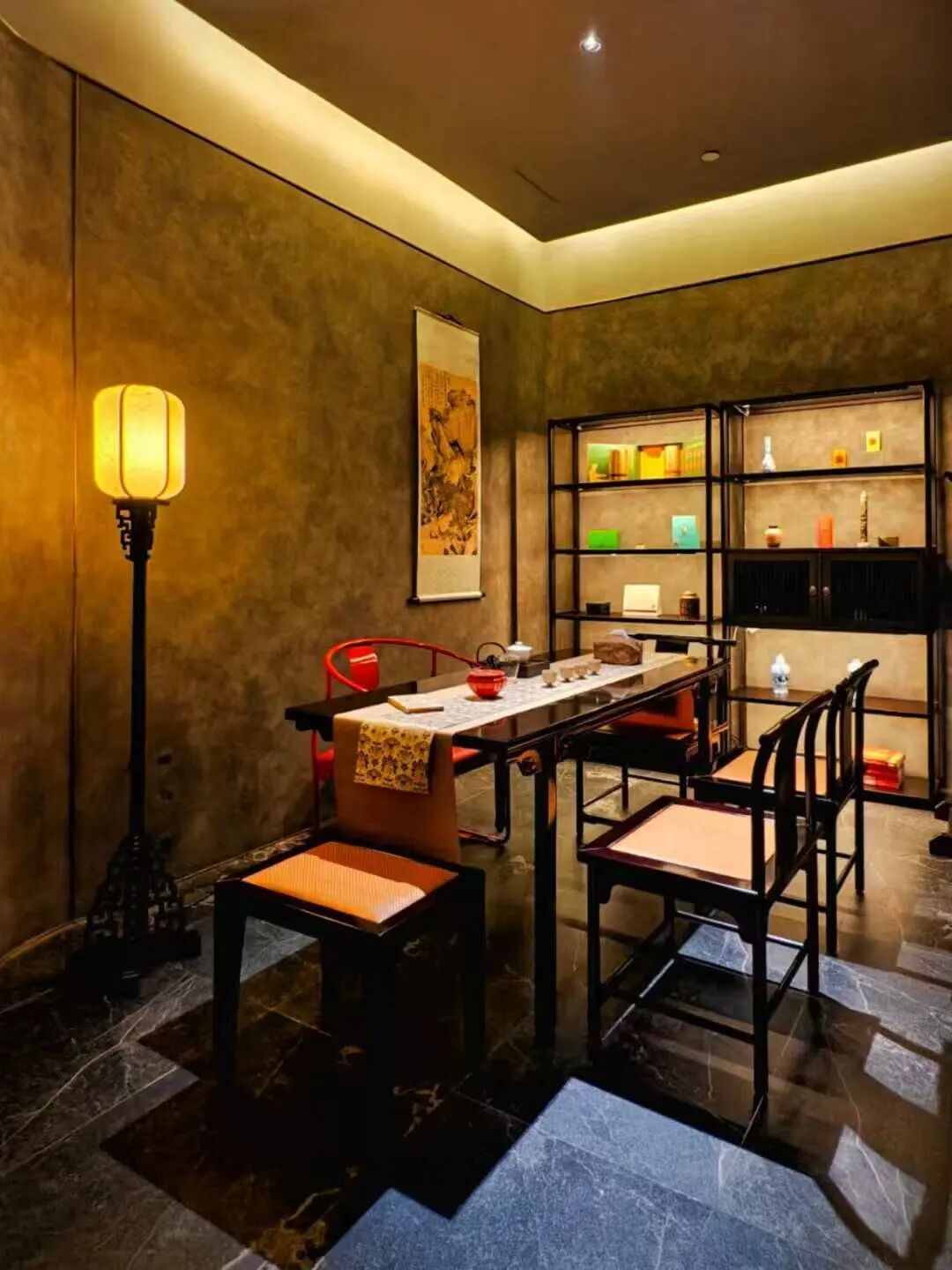 茶馆内部以黑、红、金色为主色调,营造出内敛而高级的氛围,装饰细节充满匠心。整体设计灵感源自历史典故"武侯遗种,孔明兴茶",寓意茶祖诸葛亮推广茶文化的精神;空间布局包括六间以"地、人、风、月、山、云"命名的雅致包房,适合商务洽谈或私密聚会,部分区域还设有观景露台可远眺城市景观。